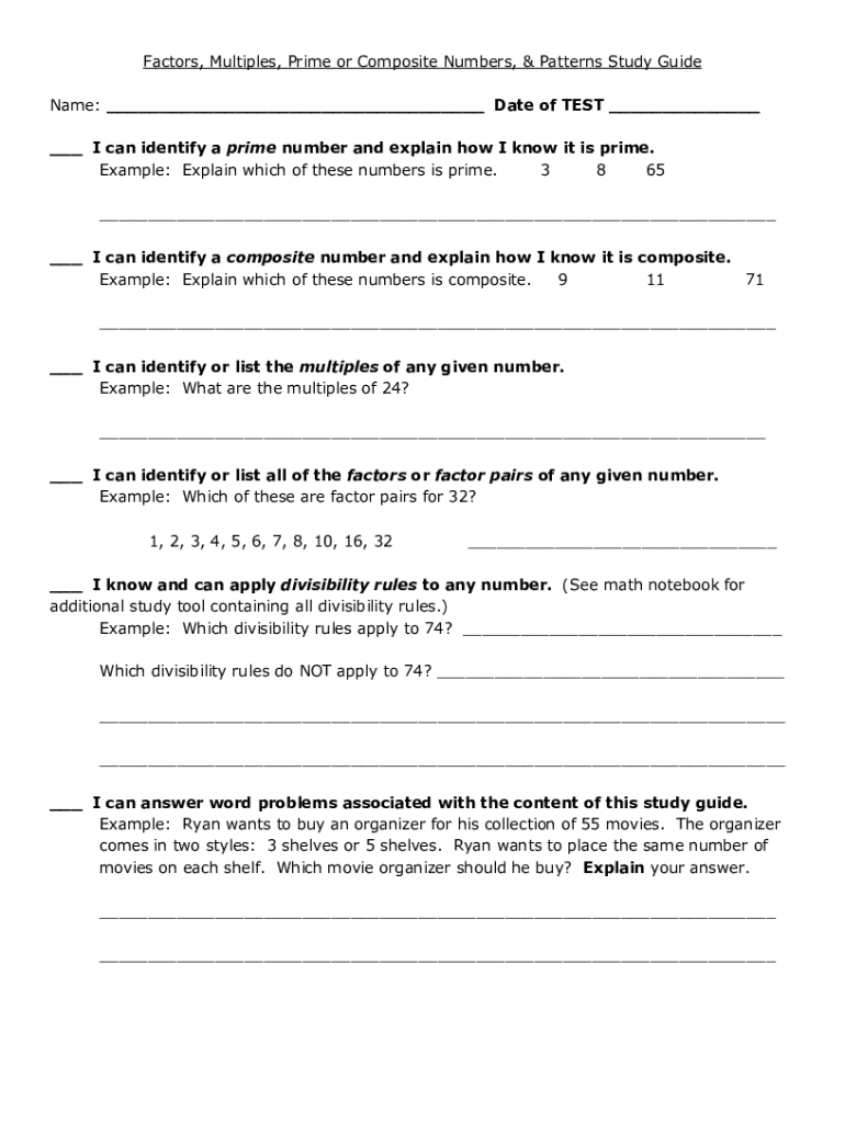 Factors, Multiples, Prime or Composite Numbers, & Patterns Study Guide Name: ___ Date of TEST ___ ___ I can identify a prime number and explain how I know it is prime. Example: Explain which of these