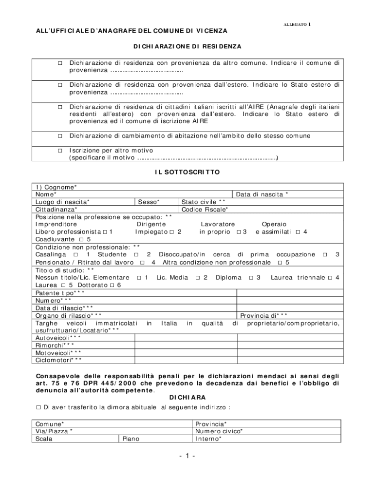 DICHIARAZIONE DI RESIDENZADichiarazione DI residents con provenience the alto commune. Indicate IL commune DI