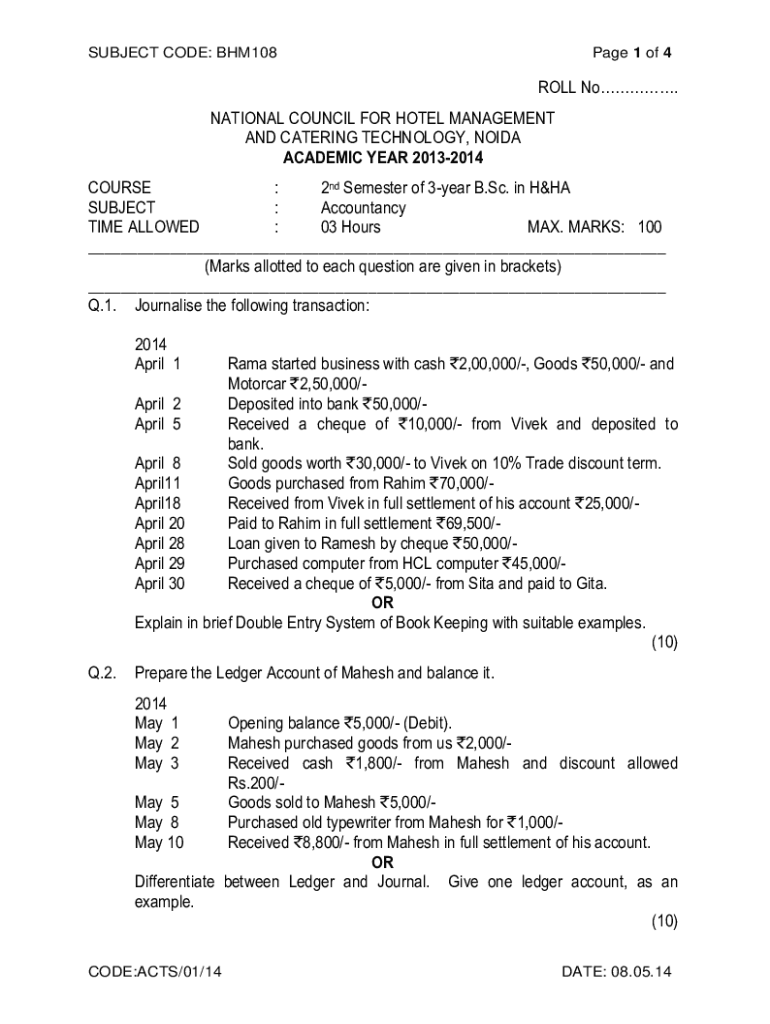 SUBJECT CODE: BHM108Page 1 of 4ROLL No. NATIONAL COUNCIL FOR HOTEL MANAGEMENT AND CATERING TECHNOLOGY, NOIDA ACADEMIC YEAR 20132014 COURSE : 2nd Semester of 3year B.Sc. in H&HA SUBJECT : Accountancy