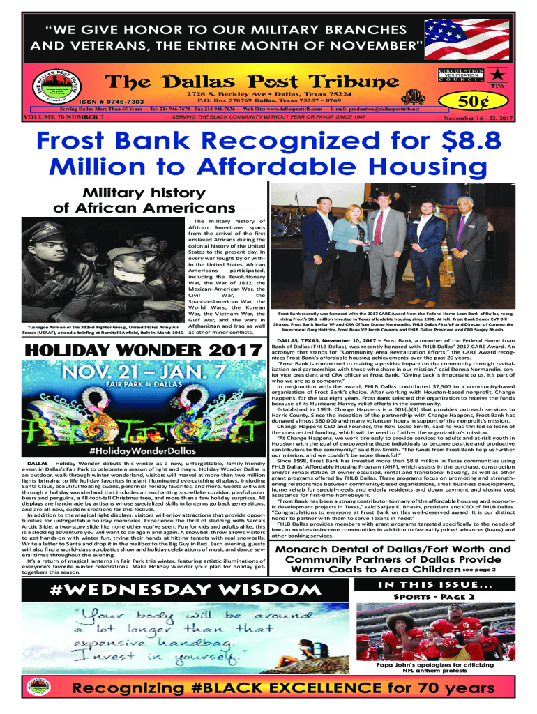 WE GIVE HONOR TO OUR MILITARY BRANCHES AND VETERANS, THE ENTIRE MONTH OF NOVEMBER\"2726 S. Beckley Ave Dallas, Texas 75224 ISSN # 07467303P.O. Box 570769 Dallas, Texas 75357 0769Serving Dallas More