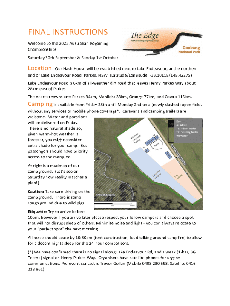 Saturday 30th September & Sunday 1st OctoberLocationOur Hash House will be established next to Lake Endeavor, at the northern