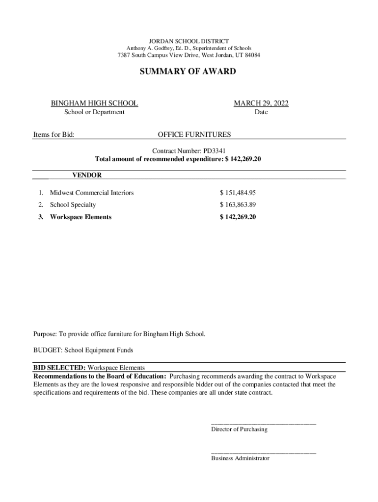 JORDAN SCHOOL DISTRICT Anthony A. Godfrey, Ed. D., Superintendent of Schools7387 South Campus View Drive, West Jordan, UT 84084SUMMARY OF AWARDBINGHAM HIGH SCHOOLMARM 29, 2022School or DepartmentDateItems