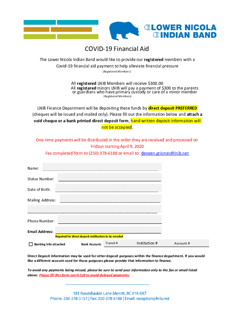 SubmitCOVID19 Financial Aid The Lower Nicola Indian Band would like to provide our registered members with a Covid19 financial aid payment to help alleviate financial pressure (Registered Members