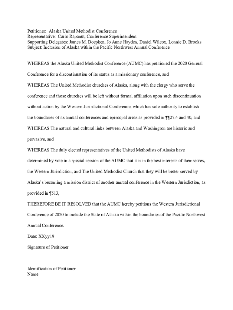 Petitioner: Alaska United Methodist Conference Representative: Carlo Rapanut, Conference Superintendent Supporting Delegates: James M. Doepken, Jo Anne Hayden, Daniel Wilcox, Lonnie D. Brooks Subject: