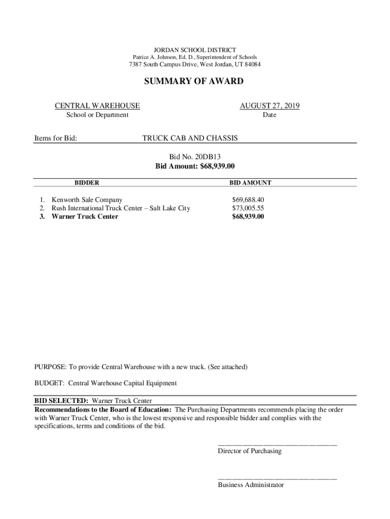 JORDAN SCHOOL DISTRICT Patrice A. Johnson, Ed. D., Superintendent of Schools7387 South Campus Drive, West Jordan, UT 84084SUMMARY OF AWARD CENTRAL WAREHOUSEAUGUST 27, 2019School or DepartmentDateItems