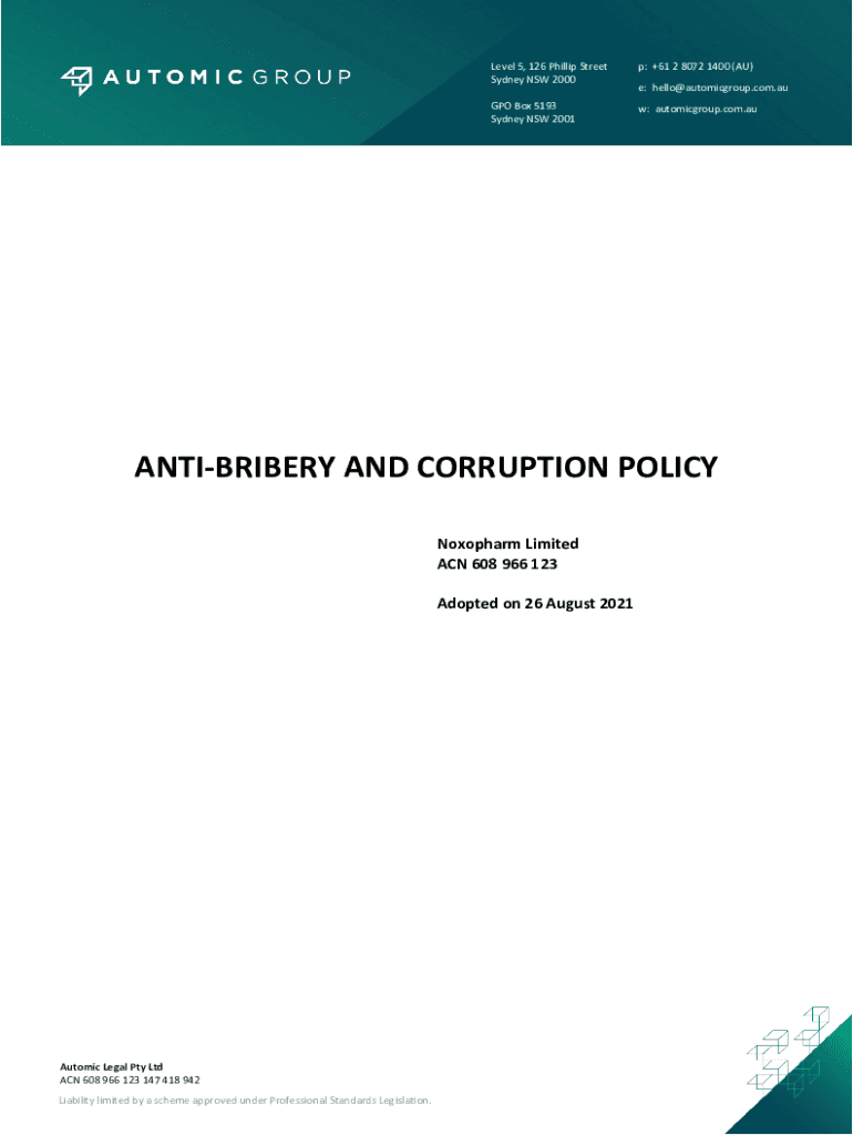 cLevel 5, 126 Phillip Street Sydney NSW 2000p: +61 2 8072 1400 (AU)GPO Box 5193 Sydney NSW 2001w: automicgroup.com.aue: hello@automicgroup.com.auANTIBRIBERY AND CORRUPTION POLICY Noxopharm Limited
