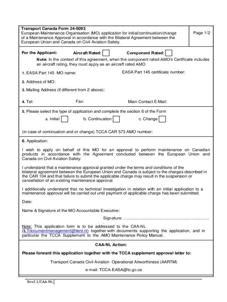 Transport Canada Form 240093 European Maintenance Organization (MO) application for initial/continuation/change of a Maintenance Approval in accordance with the Bilateral Agreement between the European