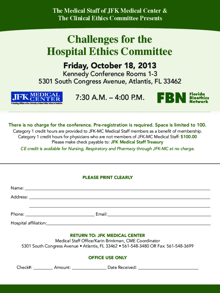 The Medical Staff of JFK Medical Center & The Clinical Ethics Committee PresentsChallenges for the Hospital Ethics Committee Friday, October 18, 2013Kennedy Conference Rooms 13 5301 South Congress