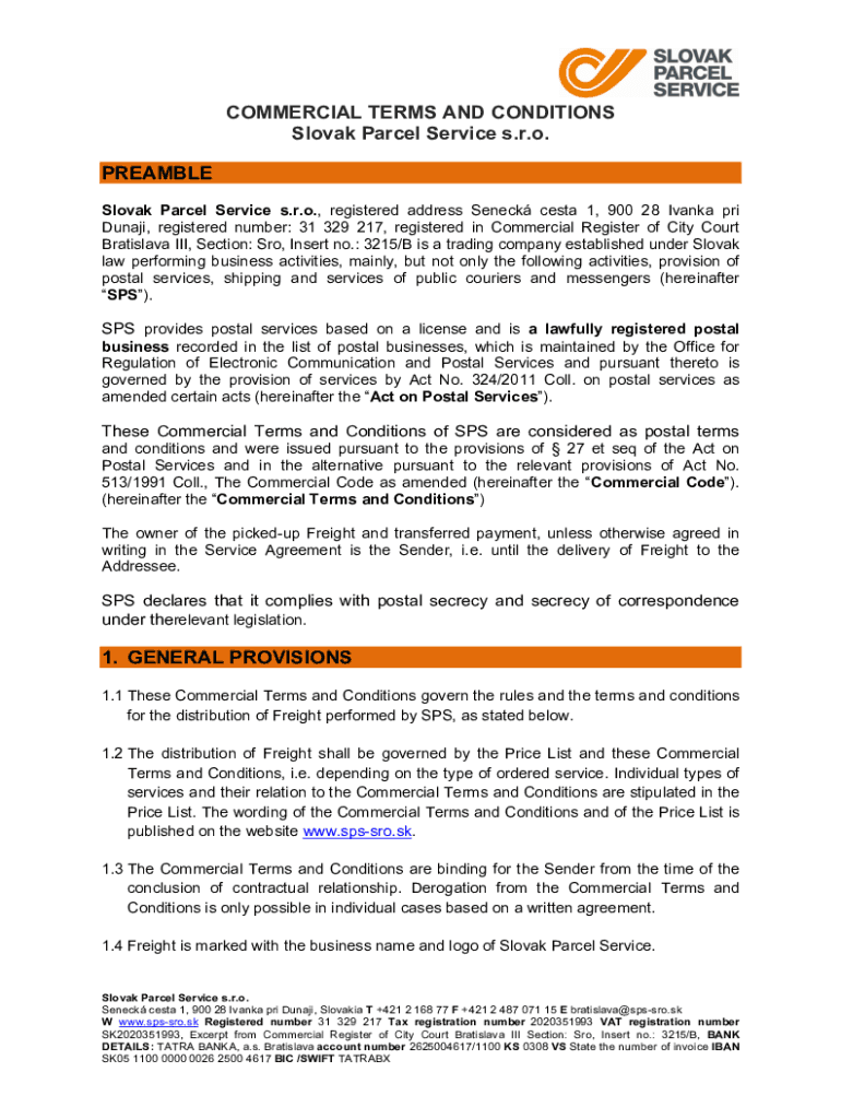 COMMERCIAL TERMS AND CONDITIONS Slovak Parcel Service s.r.o. PREAMBLE Slovak Parcel Service s.r.o., registered address Seneca Vesta 1, 900 28 Ivanka PRI Dubai, registered number: 31 329 217, registered