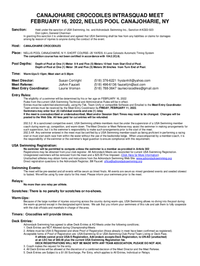 Sanction:Held under the sanction of USA Swimming, Inc. and Adirondack Swimming Inc., Sanction # AD22023