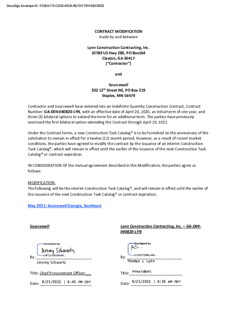 CONTRACT MODIFICATION made by and between Lynn Construction Contracting, Inc. 10789 US Hwy 280, PO Box564 Clayton, GA 30417 (Contractor) and Source well 202 12th Street NE, PO Box 219 Staples, MN