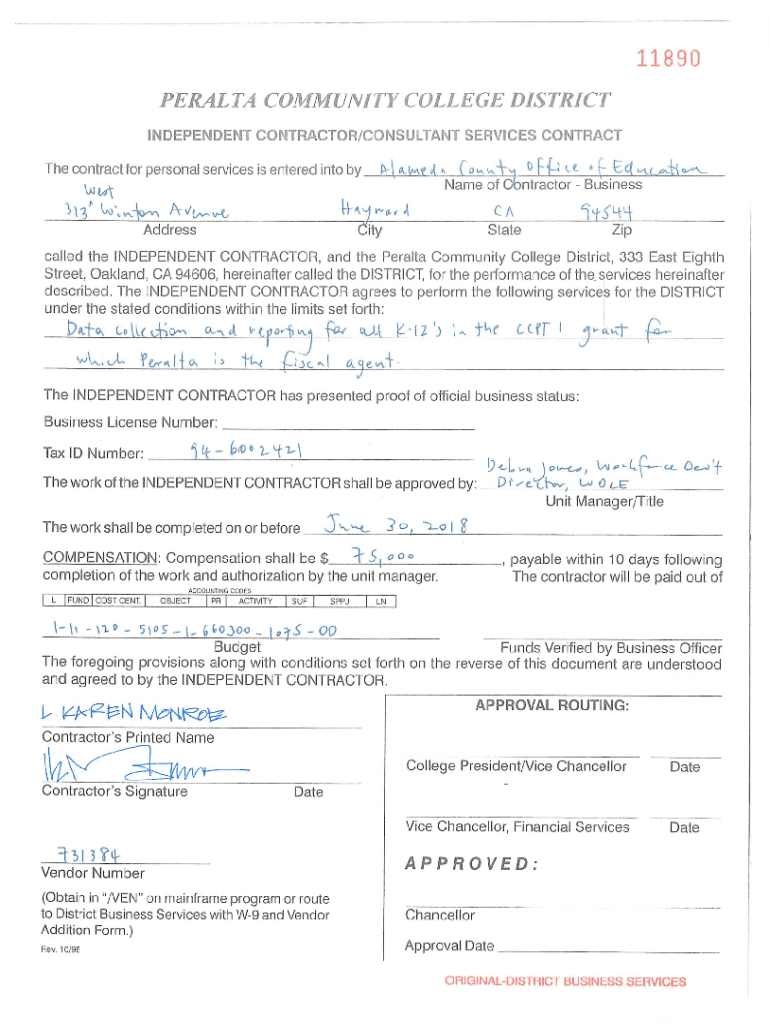 11890 PERALTA COMMUNITY COLLEGE DISTRICT INDEPENDENT CONTRACTOR/CONSULTANT SERVICES CONTRACTThe contractfor personal services is entered into byoppLf. \" Name of Oontractor Business\'^vN.VvChSt \'ityAddressStateZipcalled