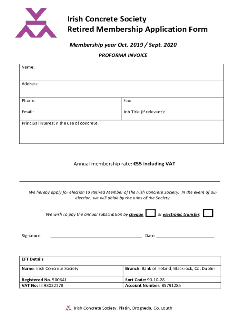 Irish Concrete Society Retired Membership Application Form Membership year Oct. 2019 / Sept. 2020 PROFORMA INVOICE Name: Address: Phone:Fax:Email:Job Title (if relevant):Principal interest n the use