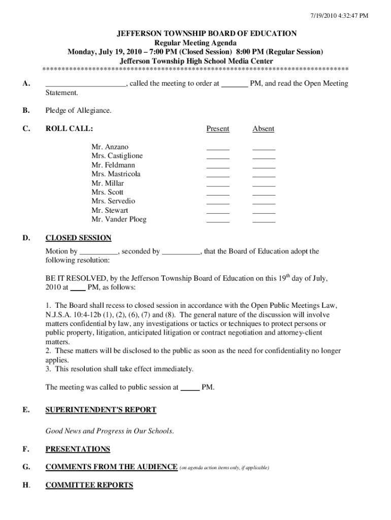 7/19/2010 4:32:47 JEFFERSON TOWNSHIP BOARD OF EDUCATION Regular Meeting Agenda Monday, July 19, 2010 7:00 PM (Closed Session) 8:00 PM (Regular Session) Jefferson Township High School Media Center
