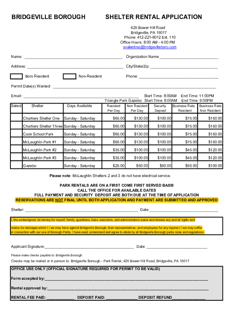 To fill out the Bridgeville Borough shelter rental, applicants typically need to complete a rental application form that includes personal information, intended use, date and time of the rental, and payment details.