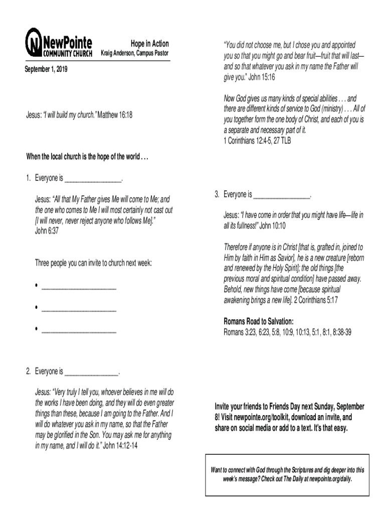 W Hope in Action Craig Anderson, Campus Pastor September 1, 2019Jesus: I will build my church. Matthew 16:18You did not choose me, but I chose you and appointed you so that you might go and bear fruit