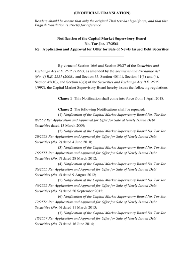 (UNOFFICIAL TRANSLATION) Readers should be aware that only the original Thai text has legal force, and that this English translation is strictly for reference.Notification of the Capital Market Supervisory