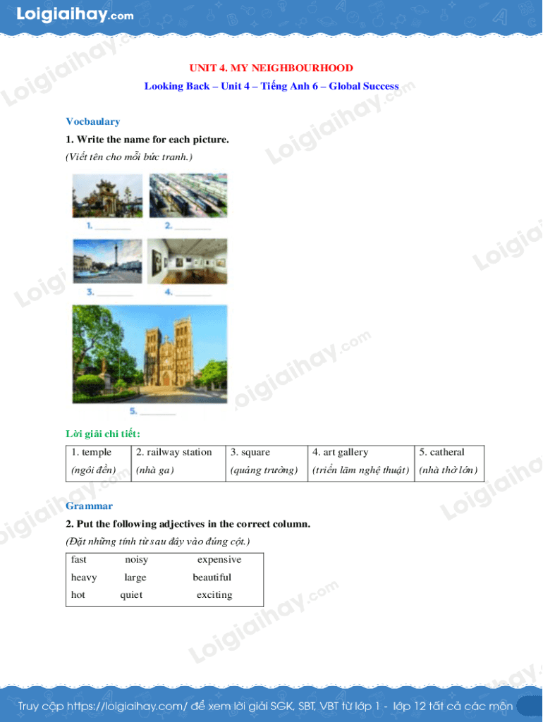 UNIT 4. MY Neighborhood Looking Back Unit 4 Ting ANH 6 Global SuccessVocbaulary 1. Write the name for each picture. (It tn CHO mi bc trans.) Li gig chi tit: 1. temple2. Railway station3. Square4.