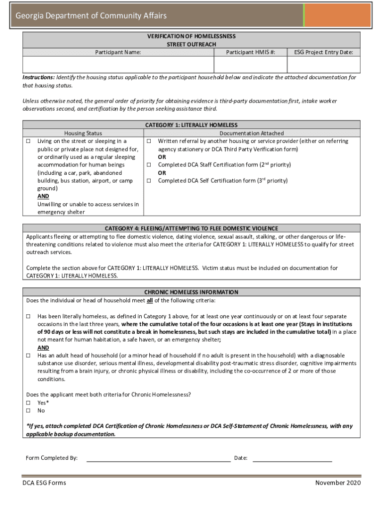 Georgia Department of Community Affairs VERIFICATION OF HOMELESSNESS STREET OUTREACH Participant Name: Participant HMIS #:ESG Project Entry Date:Instructions: Identify the housing status applicable