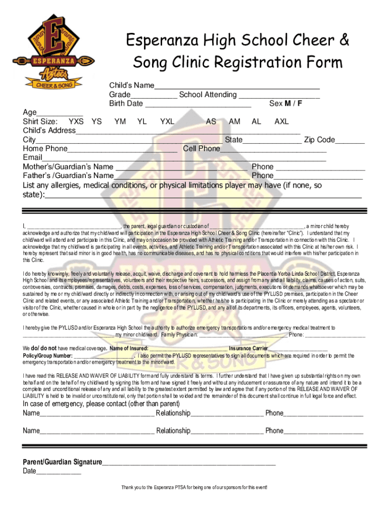 Esperanza High School Cheer & Song Clinic Registration Form Child's Name___ Grade___ School Attending ___ Birth Date ___ Sex M / F Age___ Shirt Size: YES IS YM YL AXL AS AM AL AXL Child's Address___