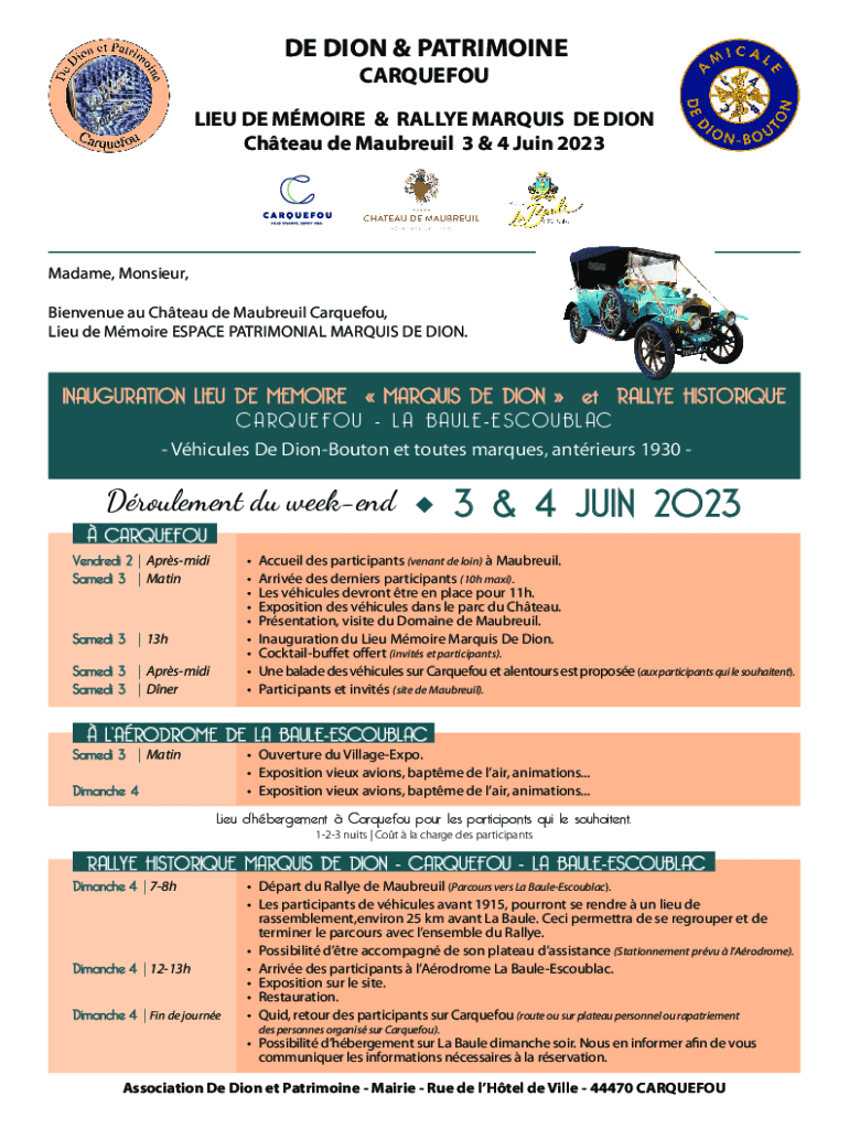 DE DION & PATRIMOINE CARQUEFOULIEU DE MMOIRE & RALLYE MARQUIS DE DION Chteau de Maubreuil 3 & 4 Juin 2023Madame, Monsieur, Bienvenue au Chteau de Maubreuil Carquefou, Lieu de Mmoire ESPACE PATRIMONIAL