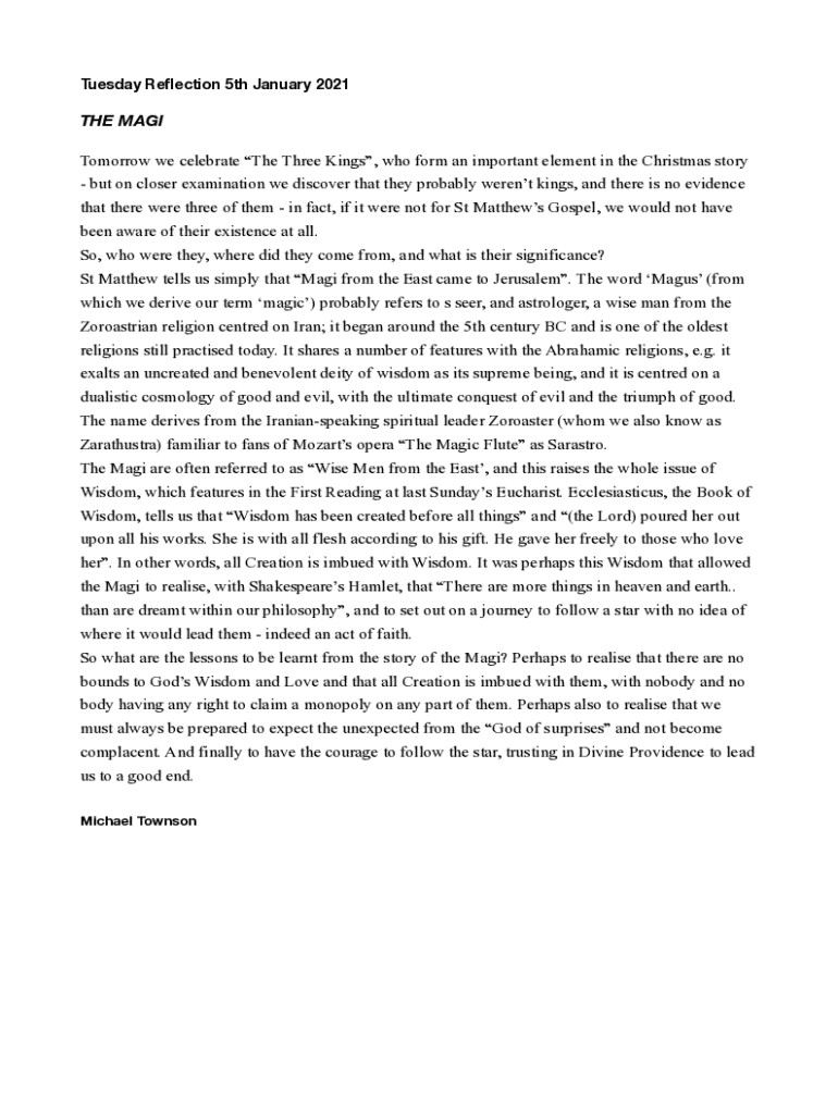 Tuesday Reflection 5th January 2021THE MAGI Tomorrow we celebrate The Three Kings, who form an important element in the Christmas story but on closer examination we discover that they probably weren't