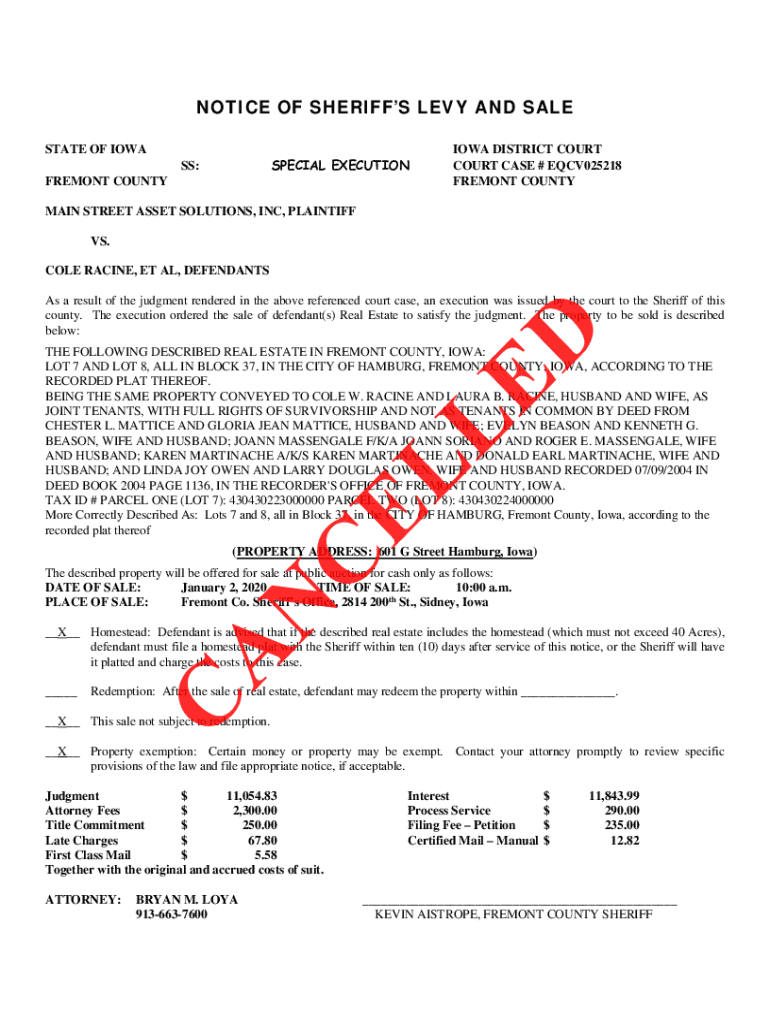 Get the free RACINE NOTICE OF SHERIFF'S LEVY SALE - Fremont County