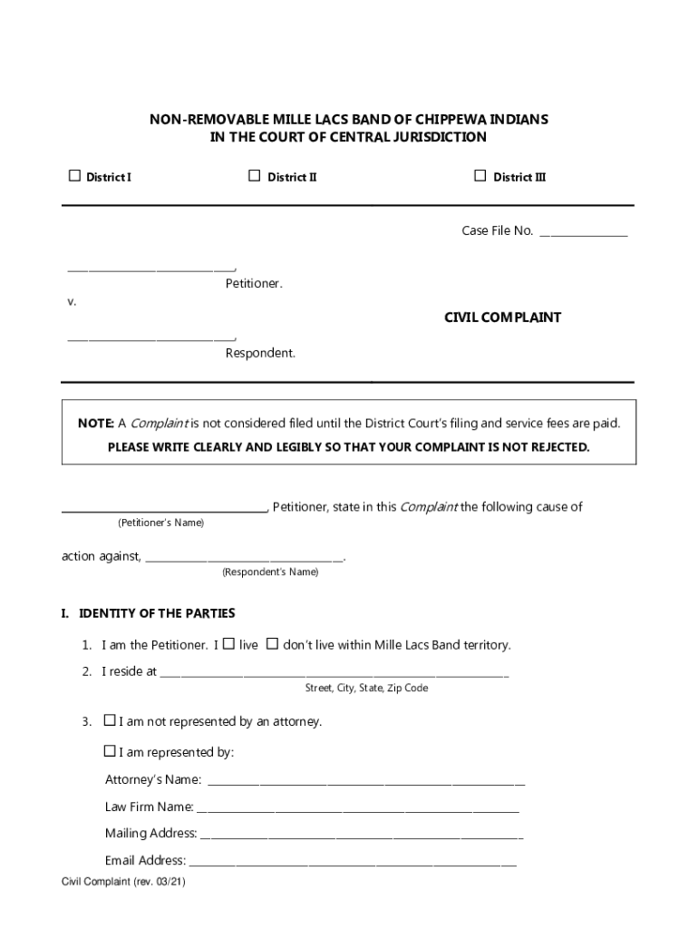 REMOVABLE MILE LACK BAND OF CHIPPEWA INDIANS IN THE COURT OF CENTRAL JURISDICTION District District District III Case File No. ___ ___, Petitioner. v.CIVIL COMPLAINT ___, Respondent.NOTE: A Complaint