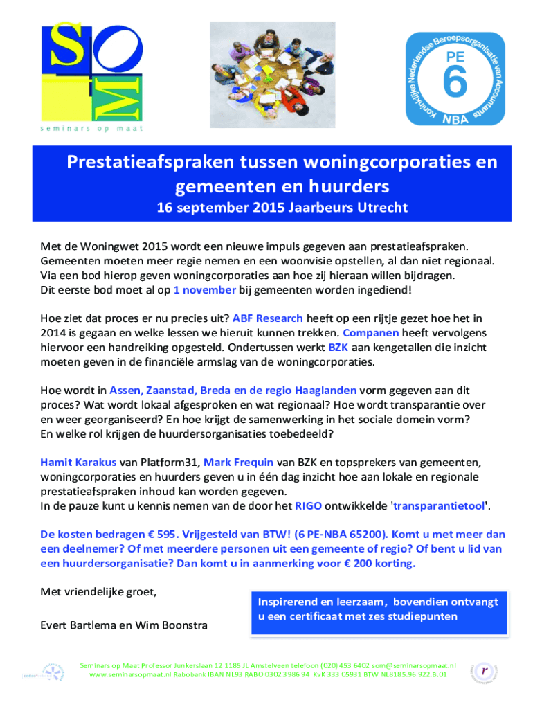 Prestatieafspraken tussenwoningcorporatiesengemeentenenhuurders16september2015JaarbeursUtrechtJaarbeurs(naastCSUtrecht) MetdeWoningwet2015wordteennieuweimpulsgegevenaanprestatieafspraken. Gemeentenmoetenmeerregienemeneneenwoonvisieopstellen,