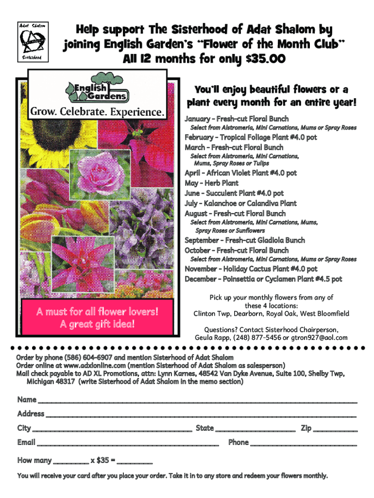 Help support The Sisterhood of Adat Shalom by joining English Gardens Flower of the Month Club All 12 months for only $35.00Youll enjoy beautiful flowers or a plant every month for an entire year!January