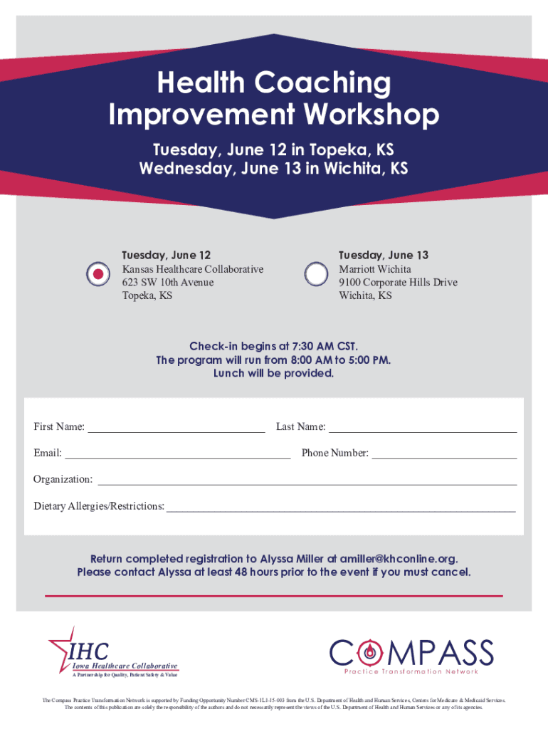 Health Coaching Improvement Workshop Tuesday, June 12 in Topeka, KS Wednesday, June 13 in Wichita, SDO you want to take your health coaching skills to the next level? Do you want some coaching practice