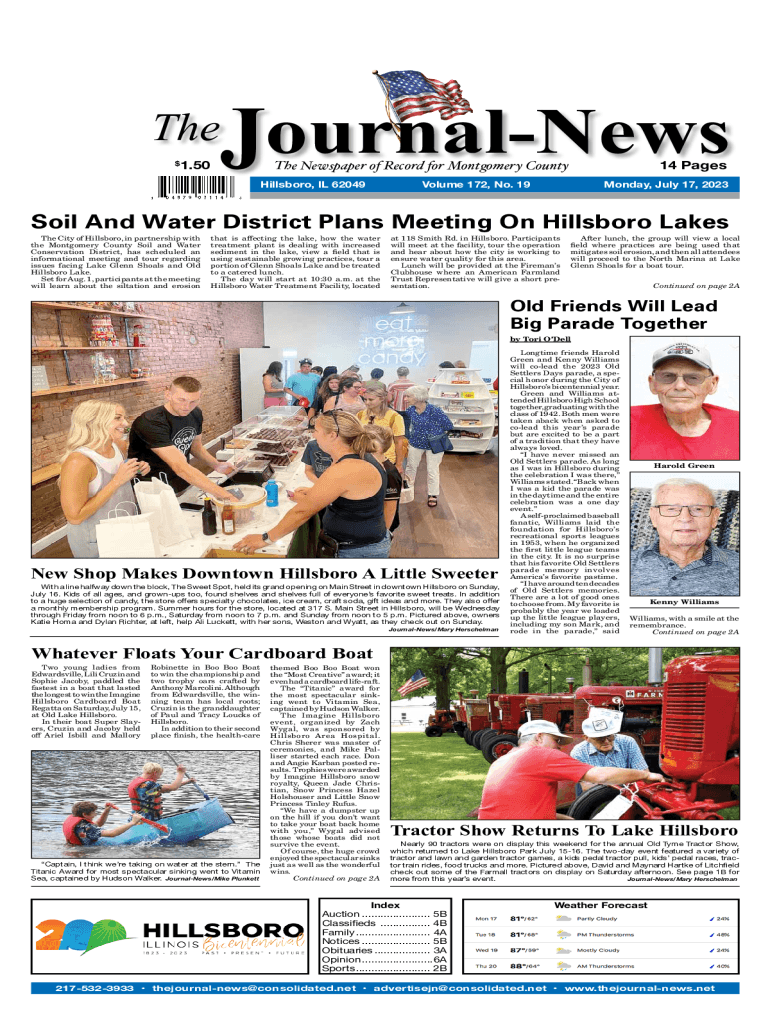 OurnalNews JThe$1.5014 Pages Newspaper of Record for Montgomery CountyHillsboro, IL 62049Volume 172, No. 19Monday, July 17, 2023Soil And Water District Plans Meeting On Hillsboro Lakes The City of