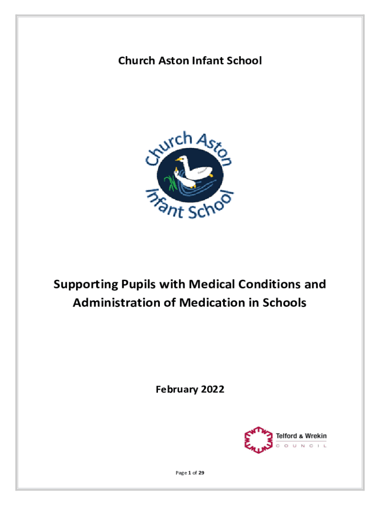 Church Aston Infant SchoolSupporting Pupils with Medical Conditions and Administration of Medication in SchoolsFebruary 2022Page 1 of 29Contents SAFE STORAGE EMERGENCY MEDICATION ....................................................................................................
