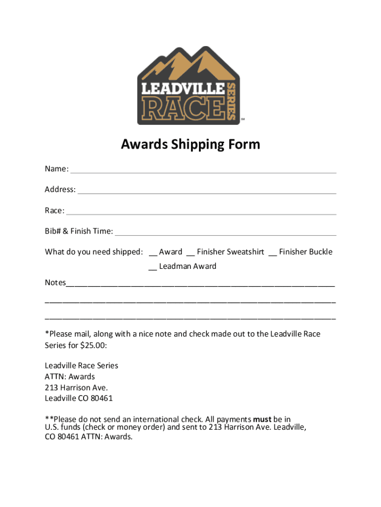 AwardsShippingForm Name: Address: Race: Bib#&FinishTime: Whatdoyouneedshipped:__Award__FinisherSweatshirt__FinisherBuckle__LeadmanAward Notes___ ___ ___ *Pleasemail,alongwithanicenoteandcheckmadeouttotheLeadvilleRace