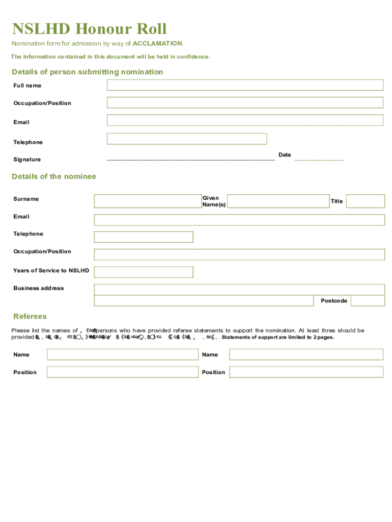 NSLHD Honour Roll Formal recognition of exceptional and outstanding service over an extended period of timePLEASE USE THIS NOMINATION FORM IF YOU WISH TO NOMINATE A PERSON BY WAY OF ACCLAMATION The
