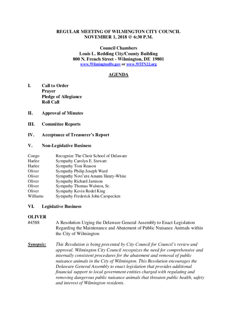 REGULAR MEETING OF WILMINGTON CITY COUNCIL NOVEMBER 1, 2018 @ 6:30 P.M. Council Chambers Louis L. Redding City/County Building 800 N. French Street Wilmington, DE 19801 www.WilmingtonDe.gov or www.WITN22.orgAGENDA