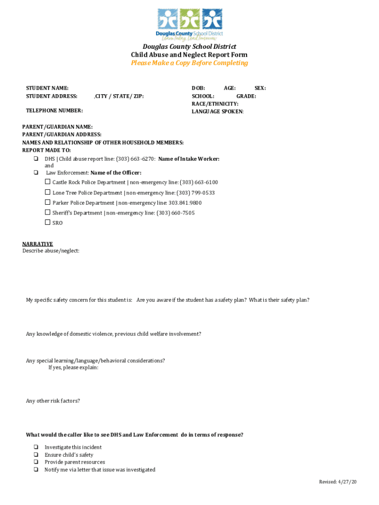 Douglas County School District Child Abuse and Neglect Report Form Please Make a Copy Before CompletingSTUDENT NAME: STUDENT ADDRESS:,CITY / STATE/ ZIP:TELEPHONE NUMBER:DOB: AGE: SEX: SCHOOL: GRADE: