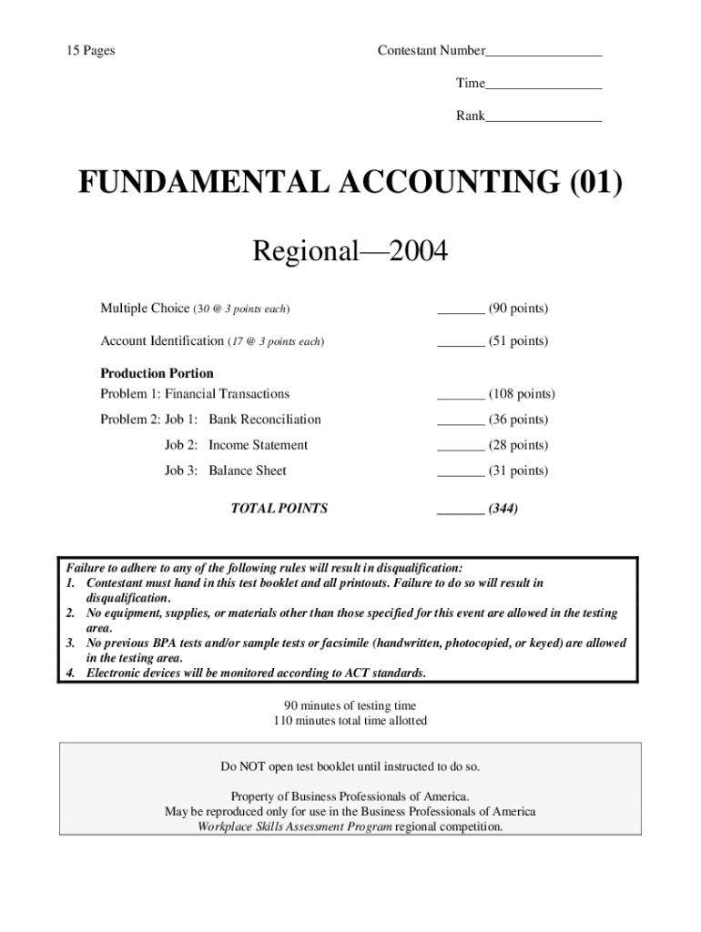 15 PagesContestant Number___ Time___ Rank___FUNDAMENTAL ACCOUNTING (01) Regional2004 Multiple Choice (30 @ 3 points each)___ (90 points)Account Identification (17 @ 3 points each)___ (51 points)Production