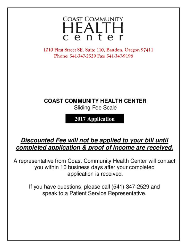 1010 First Street SE, Suite 110, Abandon, Oregon 97411 Phone: 5413472529 Fax: 5413479196COAST COMMUNITY HEALTH CENTER Sliding Fee Scale 2017 ApplicationDiscounted Fee will not be applied to your bill