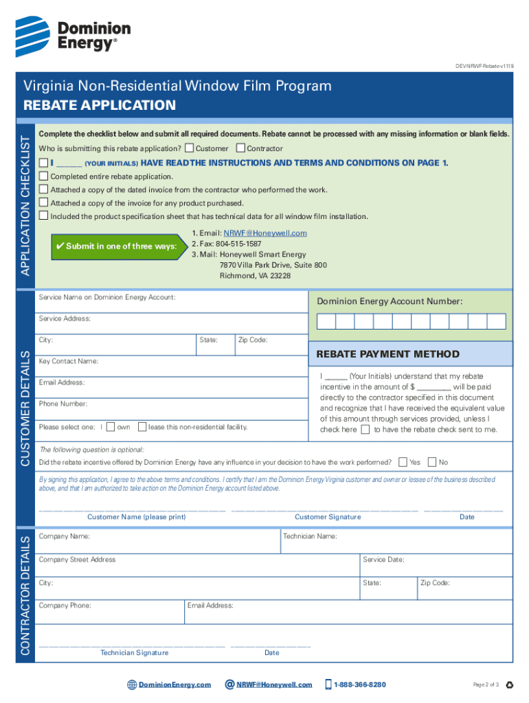 NonResidential Window Film ProgramRebate Application for Virginia DEVNRWFRebatev1119INSTRUCTIONS TO APPLY 1. CHECK PROJECT AND EQUIPMENT ELIGIBILITY Read all Terms and Conditions carefully on the