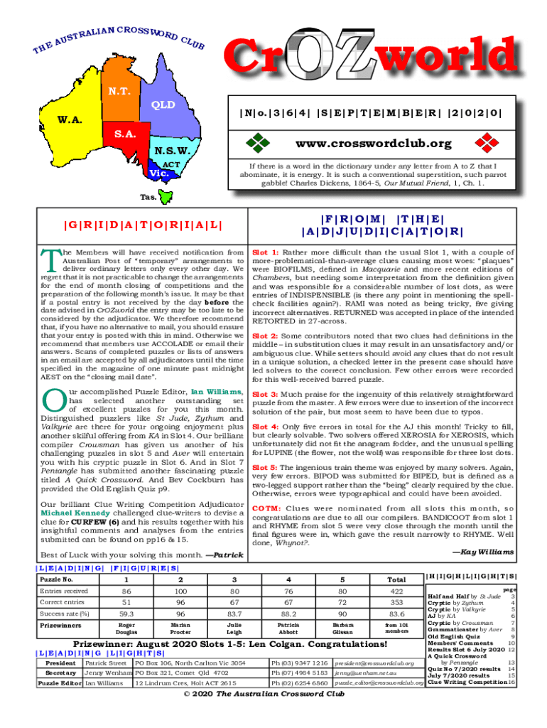 W.A.worldCrQLD|N|o.|3|6|4| |S|E|P|T|E|M|B|E|R| |2|0|2|0|S.A.www.crosswordclub.orgN. S.W.