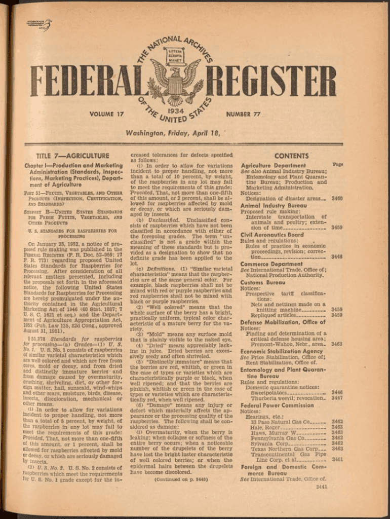 ^ O N A L4×REGISTER VOLUME 174 ^1934 0 a/i t e dNUMBER 77%Washington, Friday, April 18,TITLE 7 AGRICULTURE Chapter I Production and Marketing Administration (Standards, Inspections, Marketing Practices),