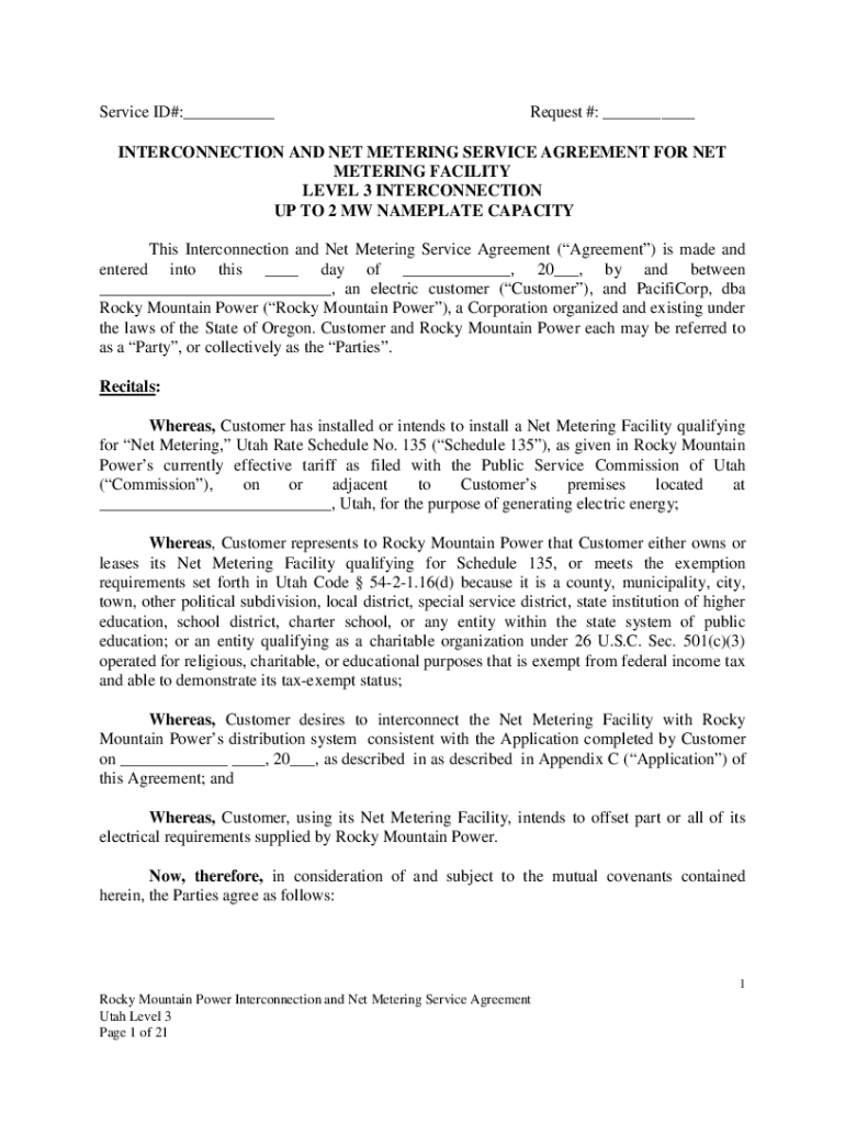 Service ID#:___Request #: ___INTERCONNECTION AND NET METERING SERVICE AGREEMENT FOR NET METERING FACILITY LEVEL 3 INTERCONNECTION UP TO 2 MW NAMEPLATE CAPACITY This Interconnection and Net Metering