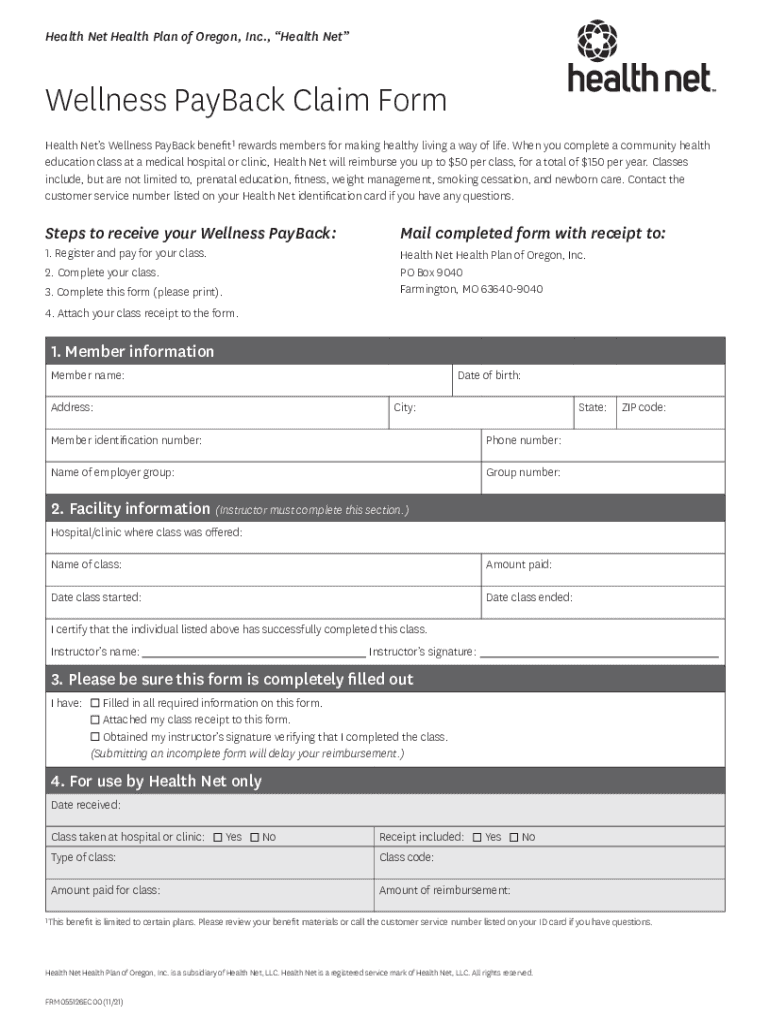 Health Net Health Plan of Oregon, Inc., Health Wellness Payback Claim Form