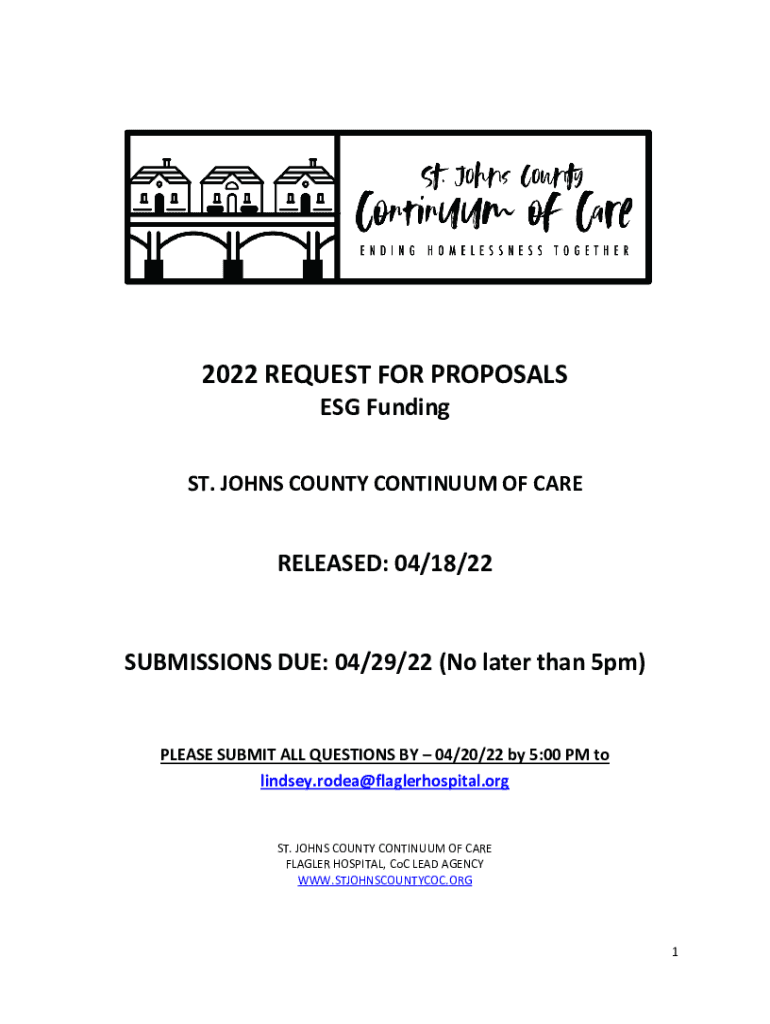 2022 REQUEST FOR PROPOSALS ESG FundingST. JOHNS COUNTY CONTINUUM OF CARERELEASED: 04/18/22 SUBMISSIONS DUE: 04/29/22 (No later than 5pm) PLEASE SUBMIT ALL QUESTIONS BY 04/20/22 by 5:00 PM to lindsey.rodea@flaglerhospital.orgST.