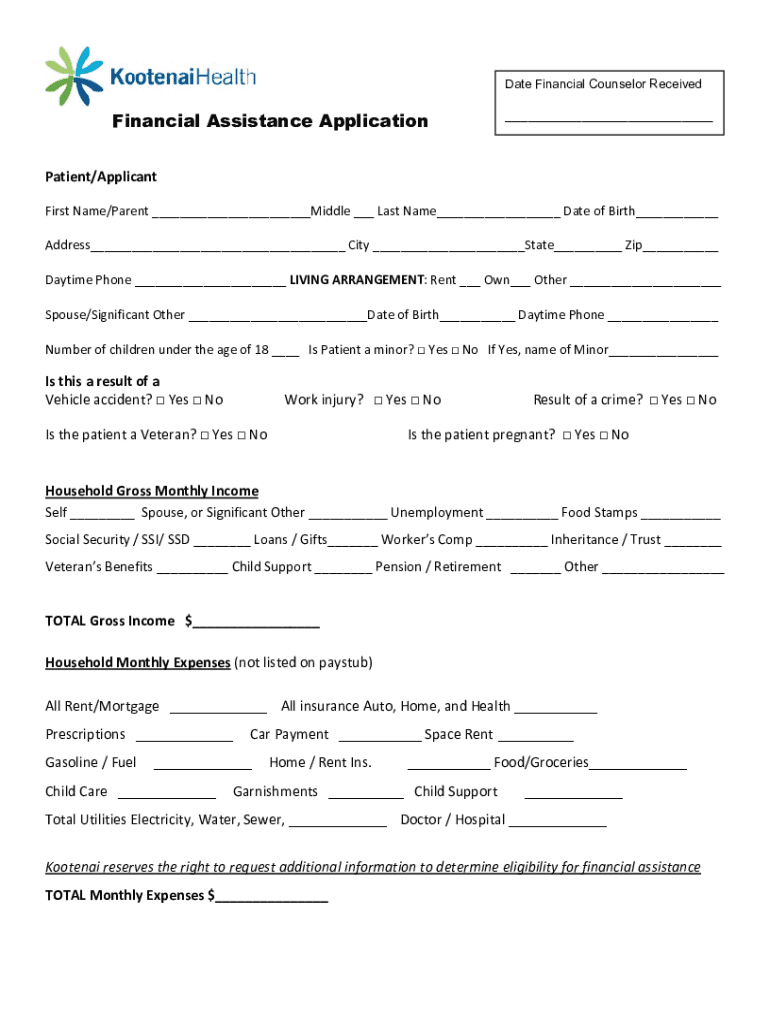 Date Financial Counselor ReceivedFinancial Assistance Application___Patient/Applicant First Name/Parent ___Middle ___ Last Name___ Date of Birth___ Address___ City ___State___ Zip___ Daytime Phone