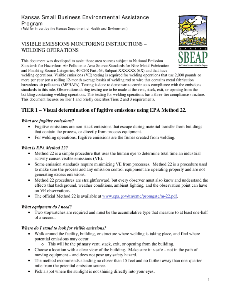Kansas Small Business Environmental Assistance Program (Paid for in part by the Kansas Department of Health and Environment)VISIBLE EMISSIONS MONITORING INSTRUCTIONS WELDING OPERATIONS This document
