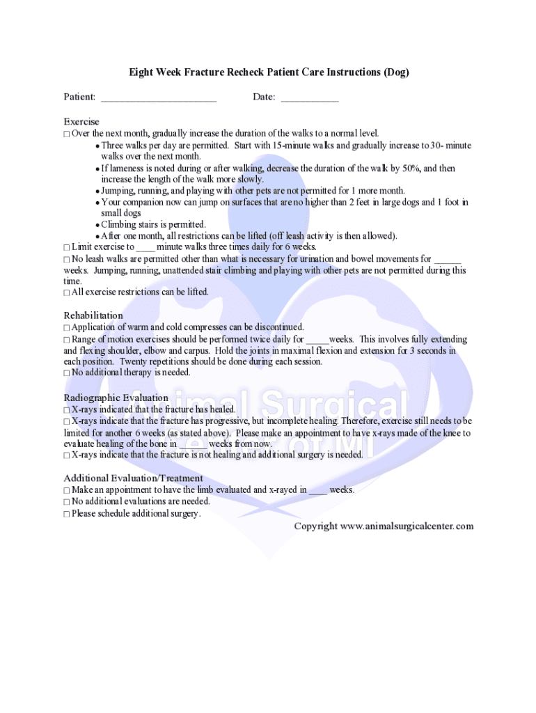 Eight Week Fracture Recheck Patient Care Instructions (Dog) Patient: ___Date: ___Exercise Over the next month, gradually increase the duration of the walks to a normal level. Three walks per day are