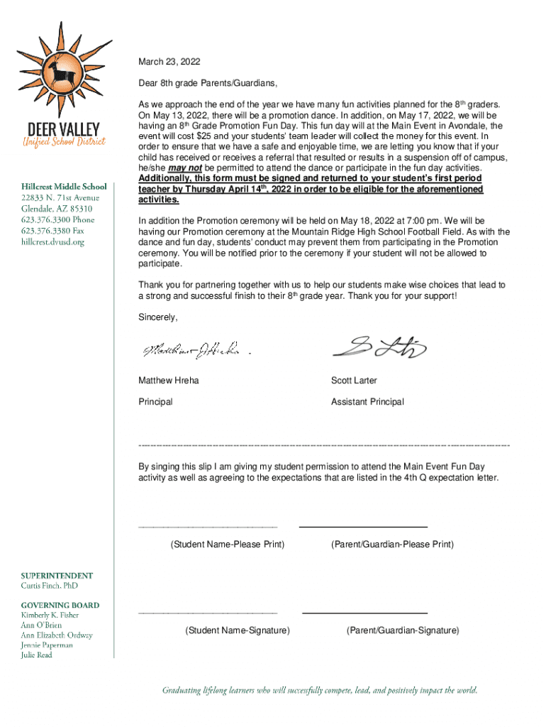 March 23, 2022 Dear 8th grade Parents/Guardians, As we approach the end of the year we have many fun activities planned for the 8 th graders. On May 13, 2022, there will be a promotion dance. In addition,