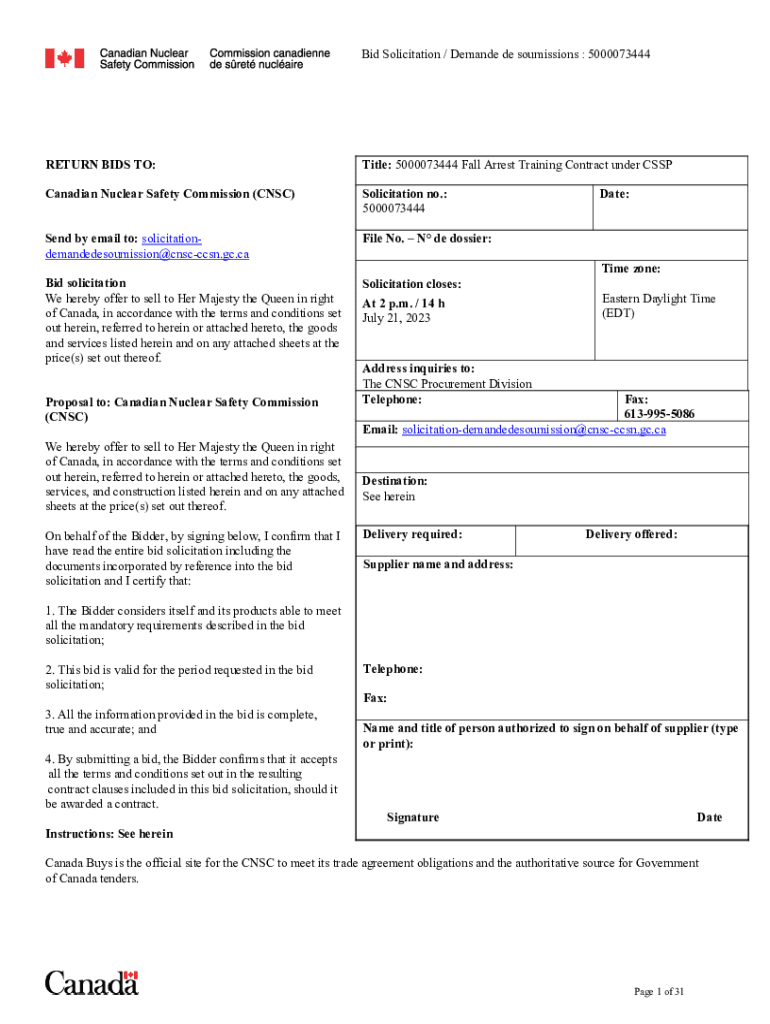 Bid Solicitation / Demand de sou missions : 5000073444RETURN BIDS TO:Title: 5000073444 Fall Arrest Training Contract under CSSPCanadian Nuclear Safety Commission (CNSC)Solicitation no.: 5000073444Send